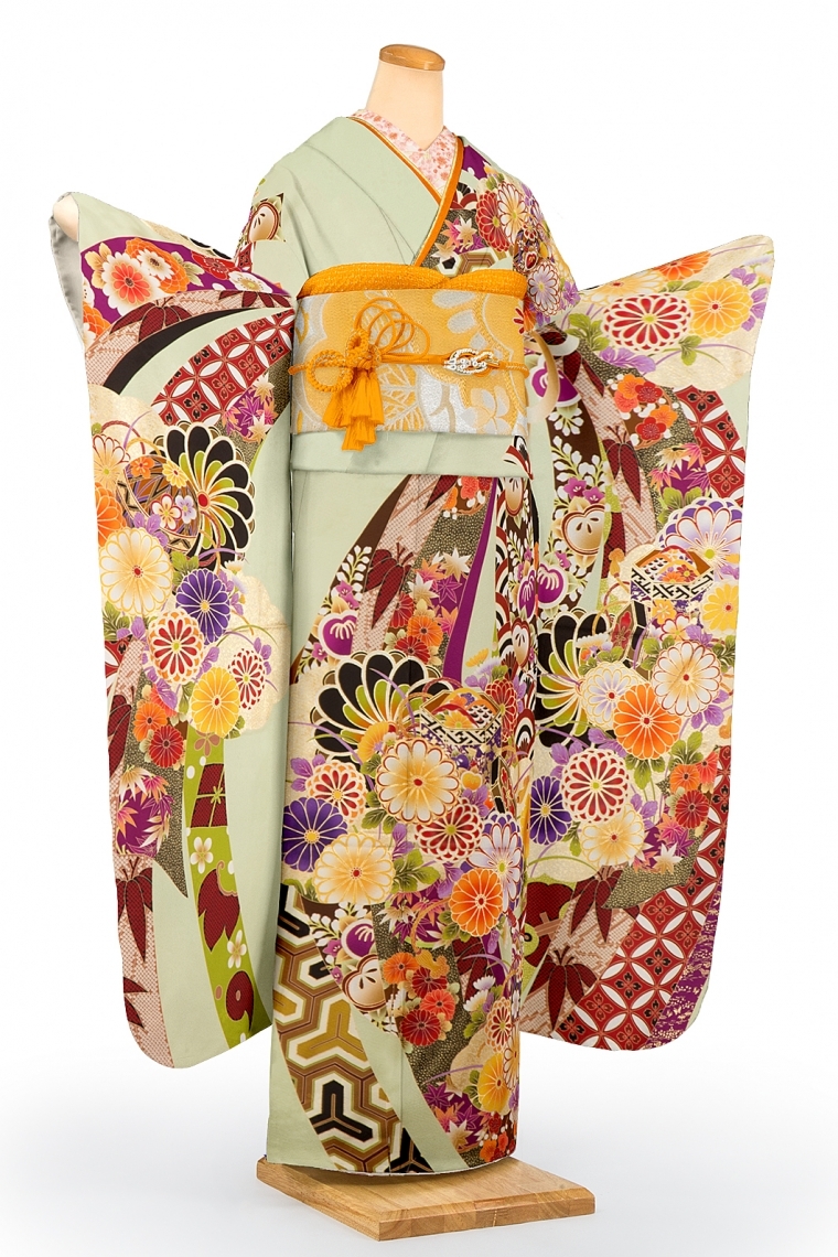 振袖レンタル 振袖Mサイズ ブランド:朝比奈彩×京舞 束熨斗四季花文 黄緑 サイズ:M 153~160cm 表地:正絹