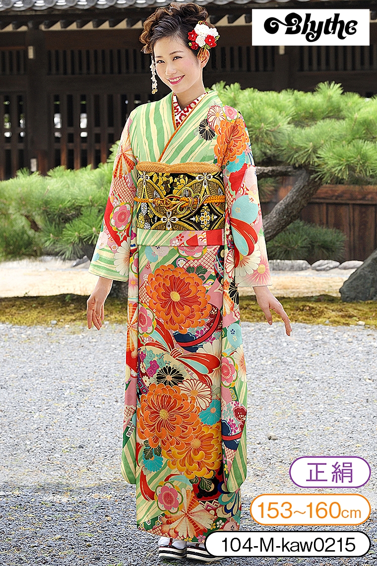 振袖レンタル 振袖Mサイズ ブランド:Blythe 菊梅に水玉 グリーン×黄 サイズ:M 153~160cm 表地:正絹