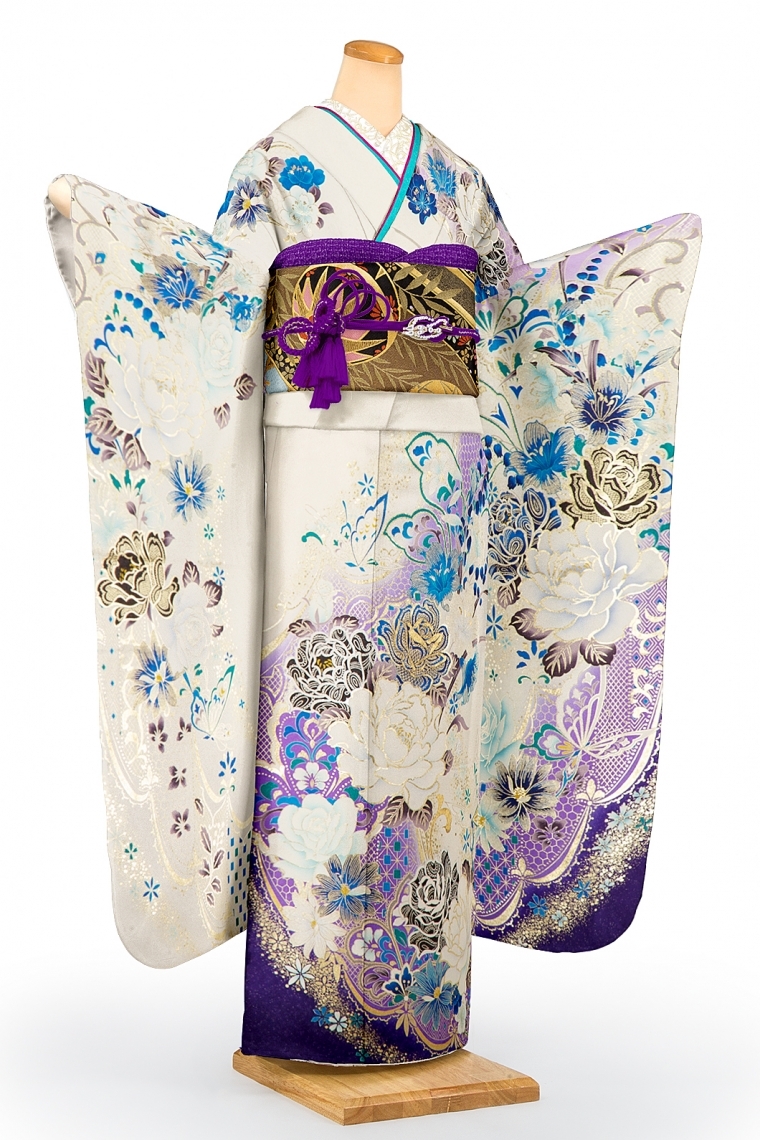 柄:大輪の牡丹に薔薇と百合に蝶舞にレース模様