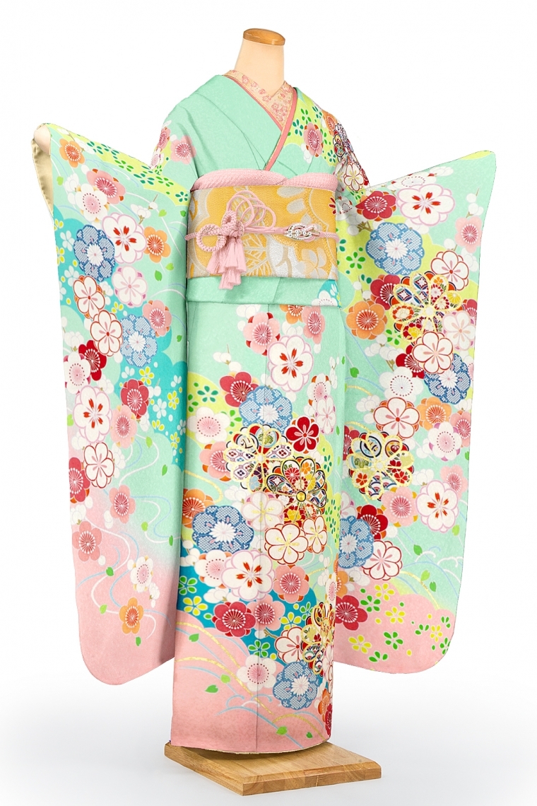 振袖レンタル 振袖LLOサイズ 梅尽くし 黄緑/ピンク サイズ:LL-O 165~175cm ゆったりサイズ 表地:正絹