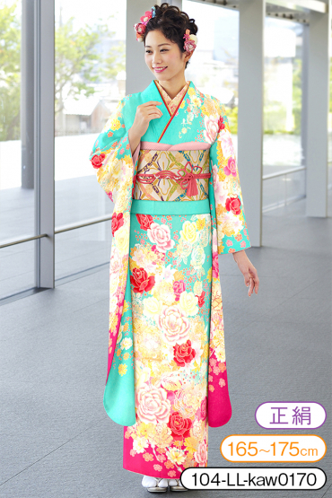 振袖レンタル 振袖LLサイズ 薔薇と百合 ミント サイズ:LL 165~175cm 表地:正絹