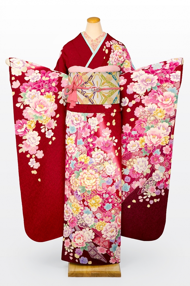 振袖レンタル 振袖MOサイズ 鞠に熨斗模様と花尽くし 赤 サイズ:M-O 153~160cm ゆったりサイズ 表地:正絹