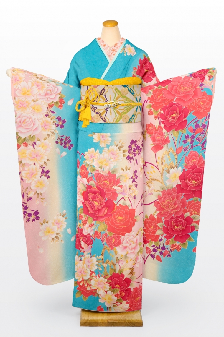 振袖レンタル 振袖SOサイズ ブランド:hiromichi nakano 花に舞う鳥 水色 サイズ:S-O 148~155cm ゆったりサイズ 表地:正絹