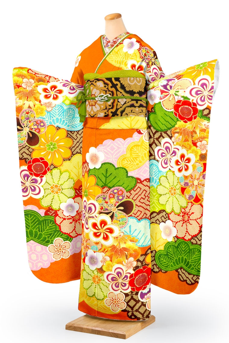 振袖レンタル 振袖Lサイズ ブランド:九重×中村里砂 疋田文様に大輪の四季花 オレンジ サイズ:L 158~168cm 表地:正絹