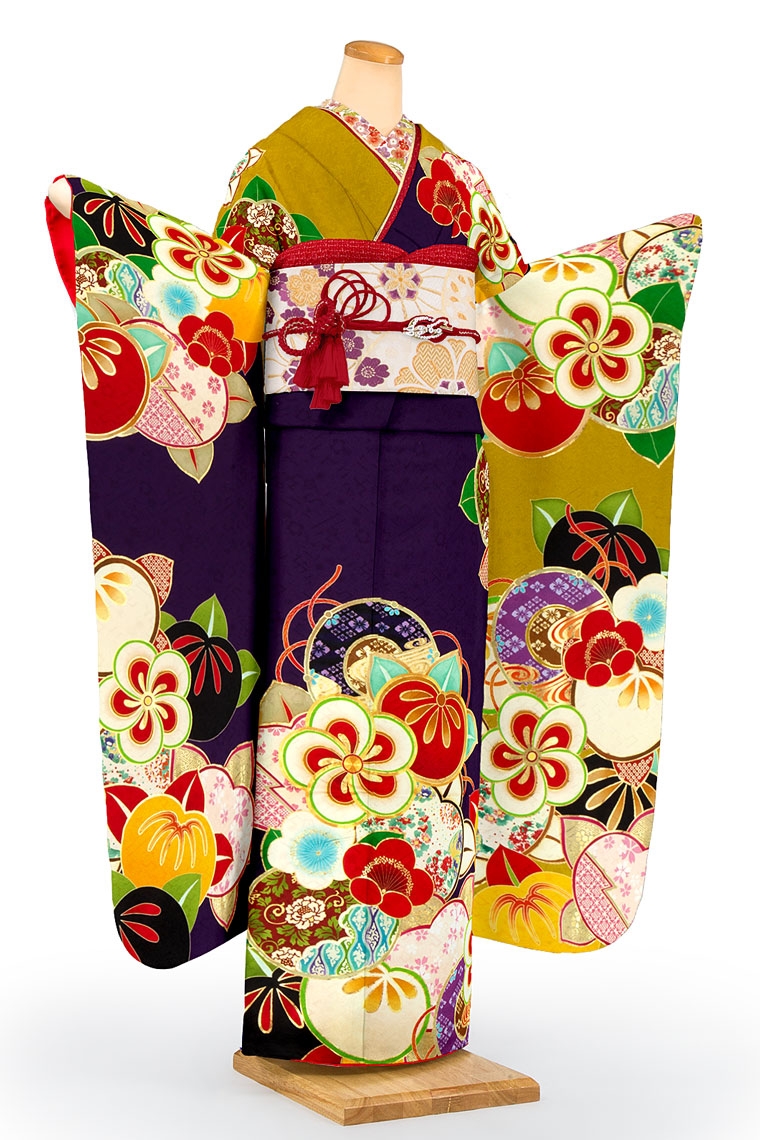 振袖レンタル 振袖LOサイズ ブランド:HAIBARA 鏡裏に梅と橘 金茶/紫 サイズ:L-O 158~168cm ゆったりサイズ 表地:正絹