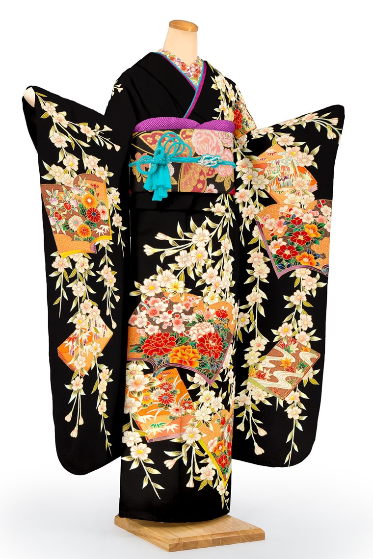 振袖レンタル 振袖Lサイズ 京友禅:染の北川 桜に絵本 黒 サイズ:L 158~168cm 表地:正絹
