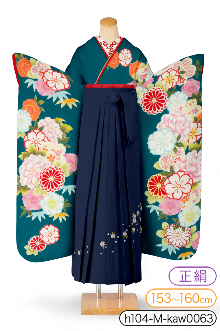 卒業式レンタル 振袖Mサイズ+袴セット 牡丹桜 深緑 サイズ:M 153~160cm 表地:正絹