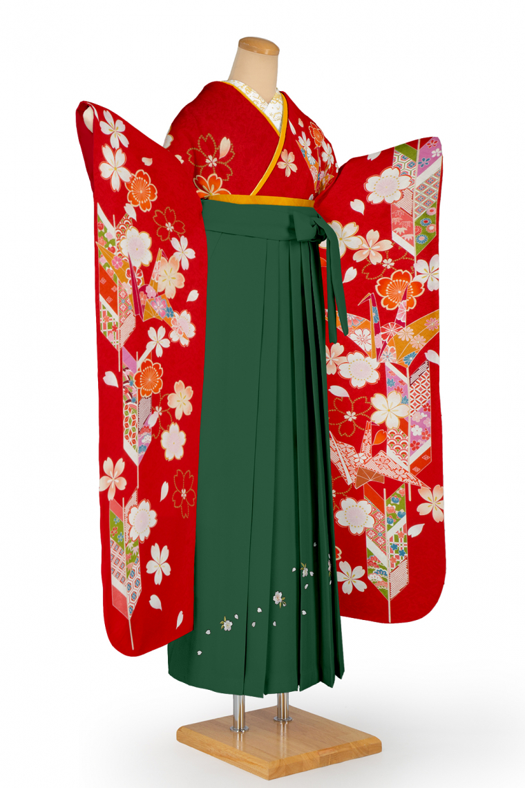 卒業式レンタル 振袖SSサイズ+袴セット 折り鶴に花矢羽 朱赤 サイズ:SS 145~150cm 表地:正絹