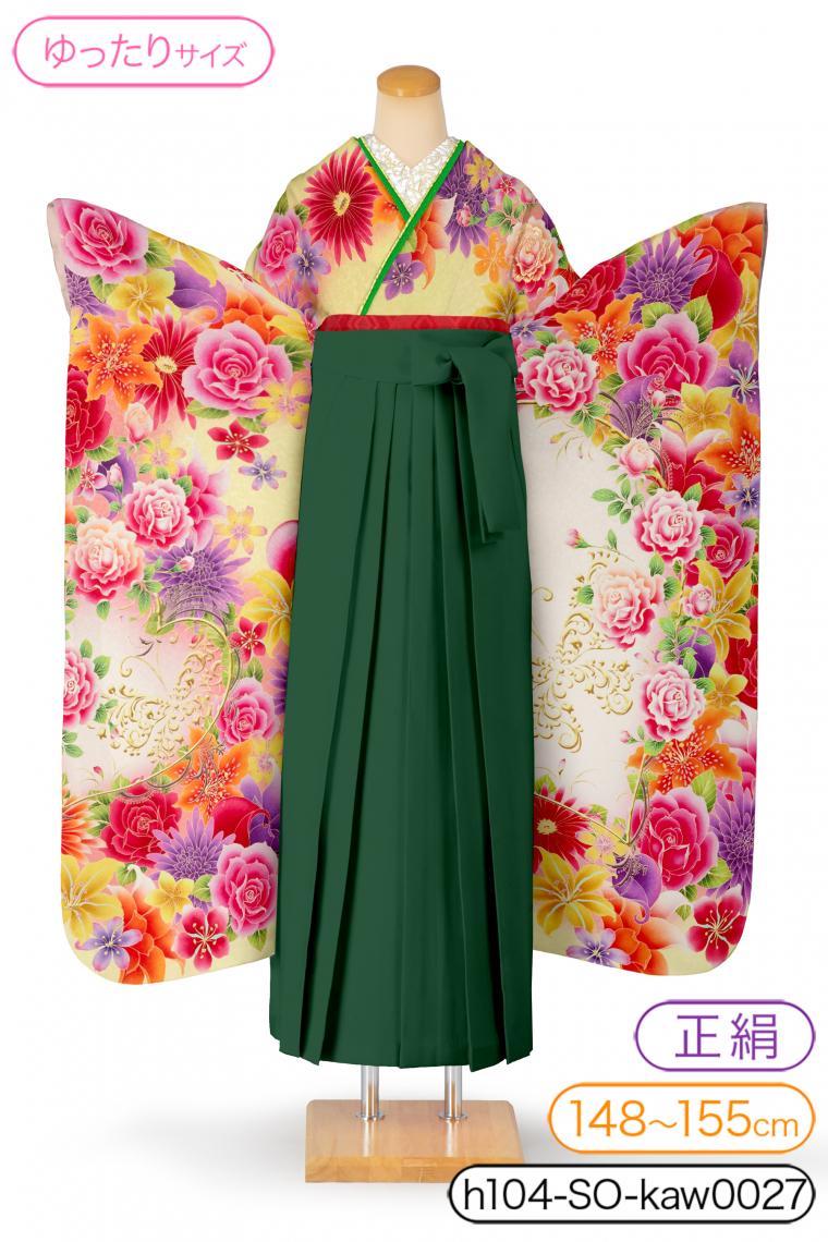 卒業式レンタル 振袖SOサイズ+袴セット ブランド:ViVi 洋花紋 クリーム サイズ:S-O 148~155cm ゆったりサイズ 表地:正絹