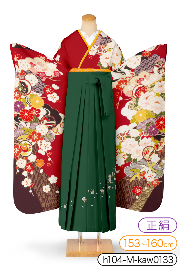卒業式レンタル 振袖Mサイズ+袴セット 雲取四季花文 赤 サイズ:M 153~160cm 表地:正絹