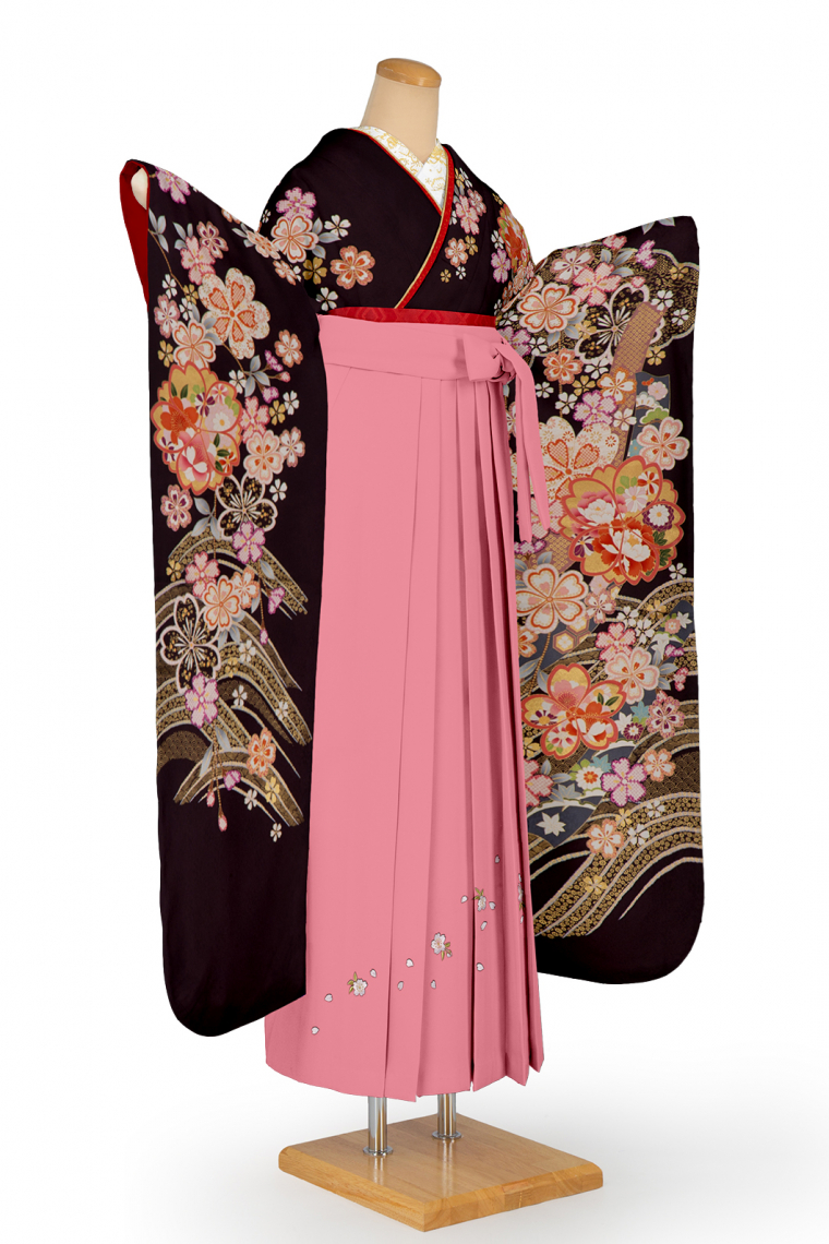 卒業式レンタル 振袖LLOサイズ+袴セット 華鈴に桜流し 濃紫茶 サイズ:LL-O 165~175cm ゆったりサイズ 表地:正絹