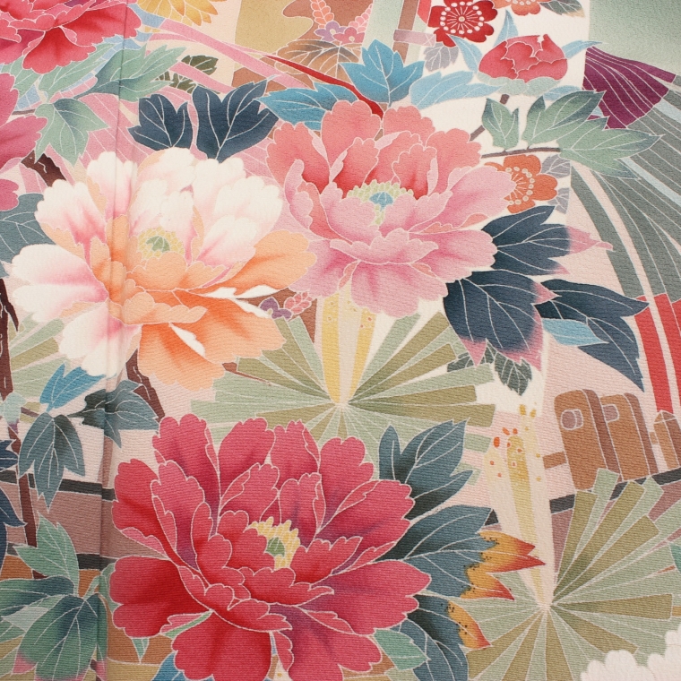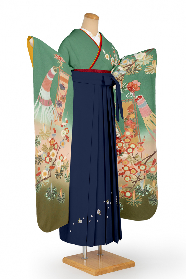 卒業式レンタル 振袖Lサイズ+袴セット 十日町友禅:田村哲彦 幟旗に牡丹松梅 緑 サイズ:L 158~168cm 表地:正絹