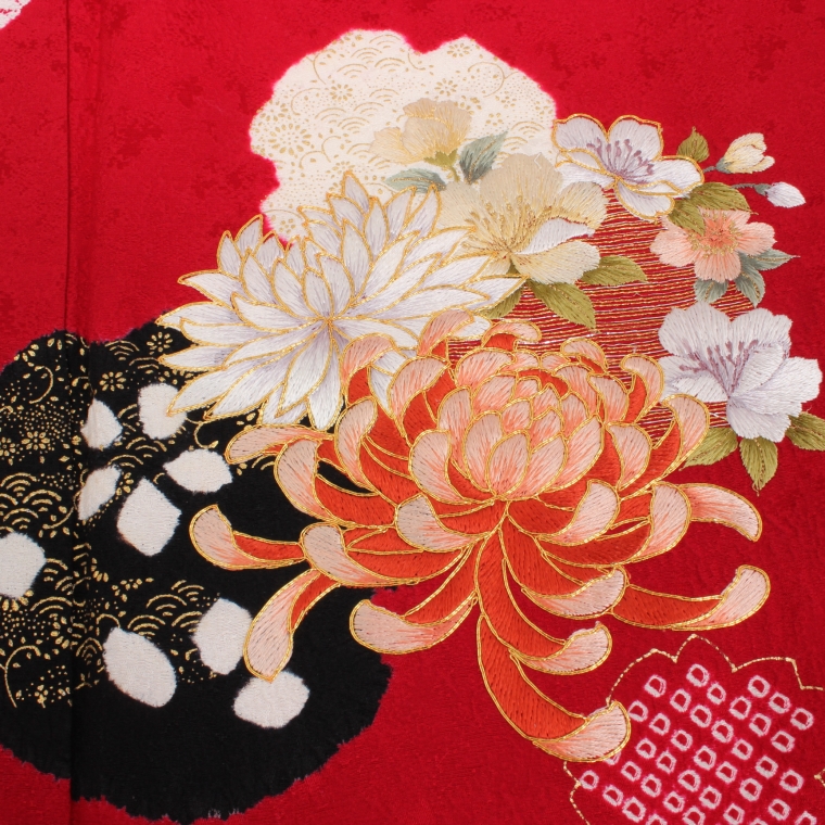 卒業式レンタル 振袖Lサイズ+袴セット 絞り 鹿の子菊 赤 サイズ:L 158~168cm 表地:正絹