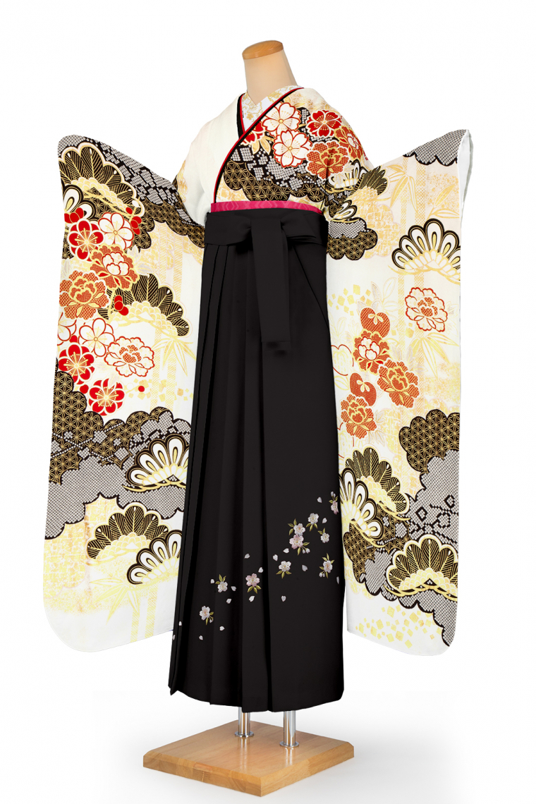 卒業式レンタル 振袖LLサイズ+袴セット 十日町友禅 絞り:滝泰 松風 白 サイズ:LL 165~175cm 表地:正絹