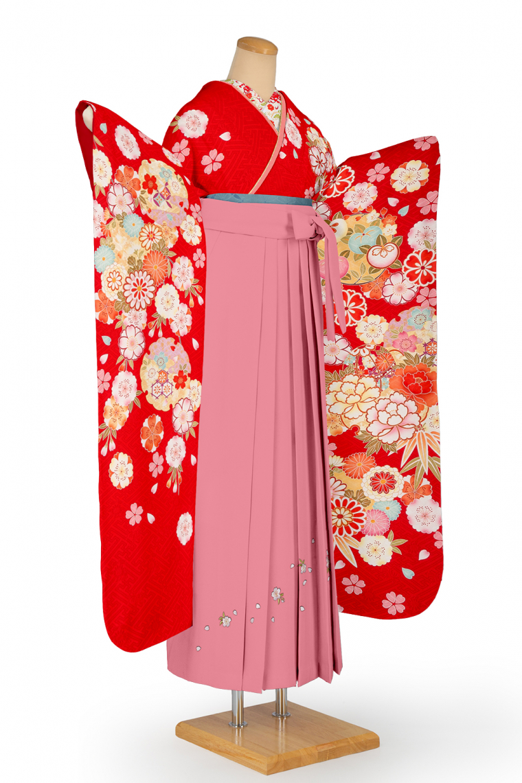 卒業式レンタル 振袖Lサイズ+袴セット 吉祥花尽し 赤 サイズ:L 158~168cm 表地:正絹