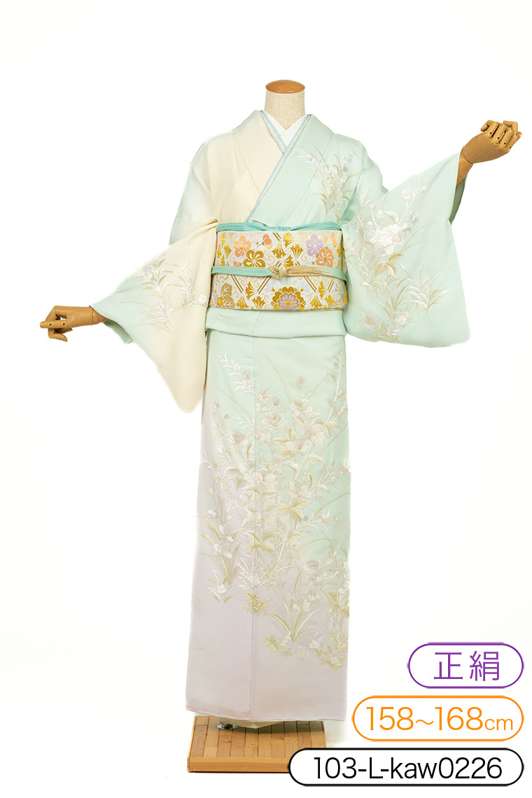 訪問着レンタル 訪問着Lサイズ 刺繍:尾峨佐染繡 華 薄緑/クリーム サイズ:L 158~168cm 表地:正絹