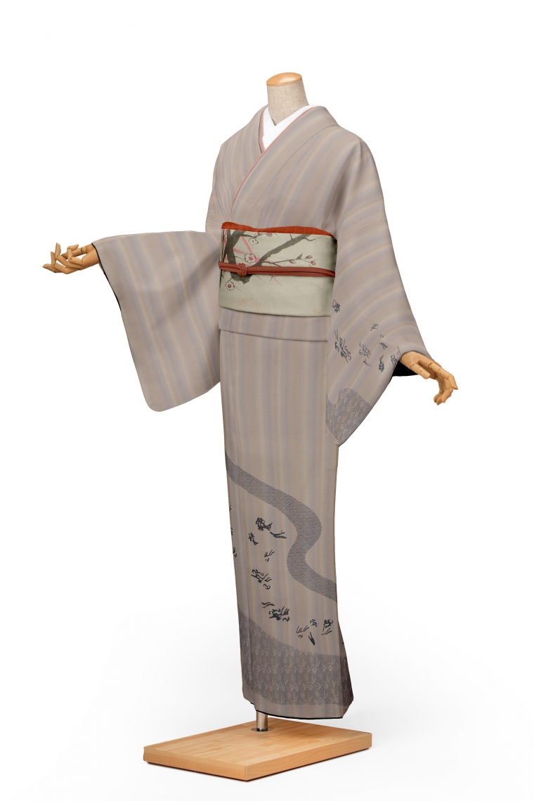 訪問着レンタル 訪問着新品 結城紬 絣:名物裂流水文 薄鼠 サイズ:LL 165~175cm 表地:正絹