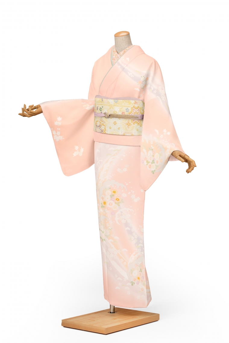訪問着レンタル 訪問着Lサイズ 波頭に花 ピンク サイズ:L 158~168cm 表地:正絹