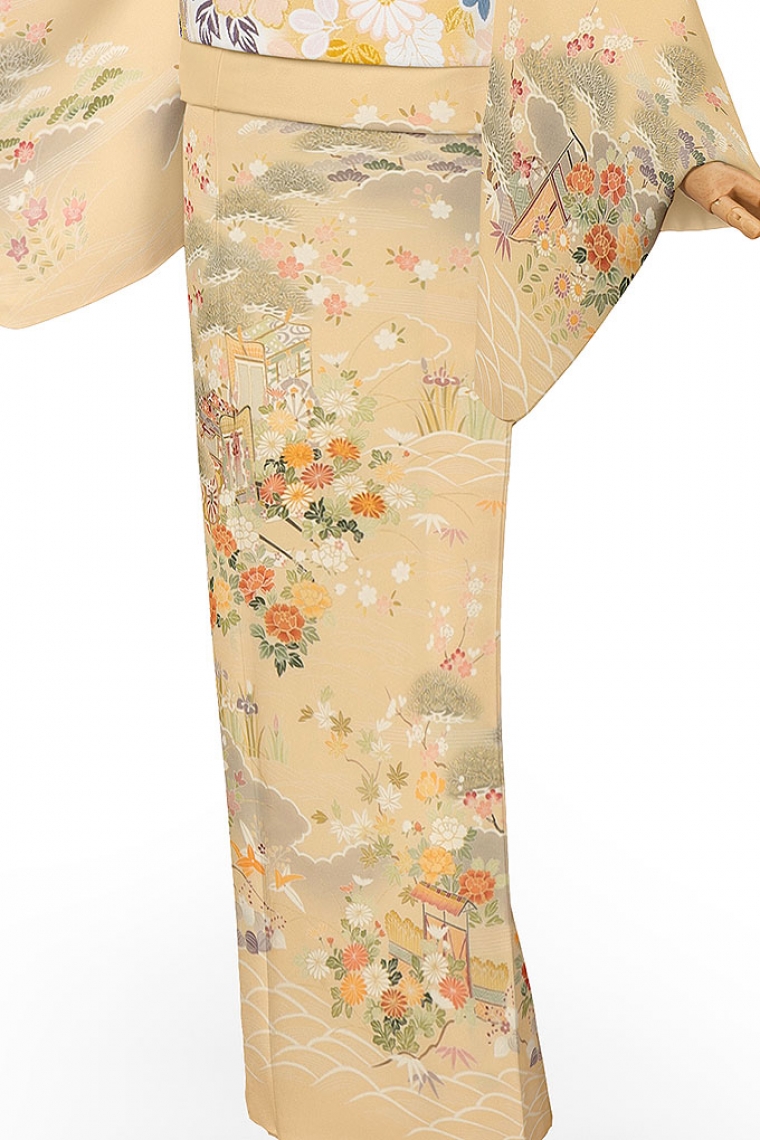 訪問着レンタル 訪問着LLサイズ 御所車四季花 濃クリーム サイズ:LL 165~175cm 表地:正絹