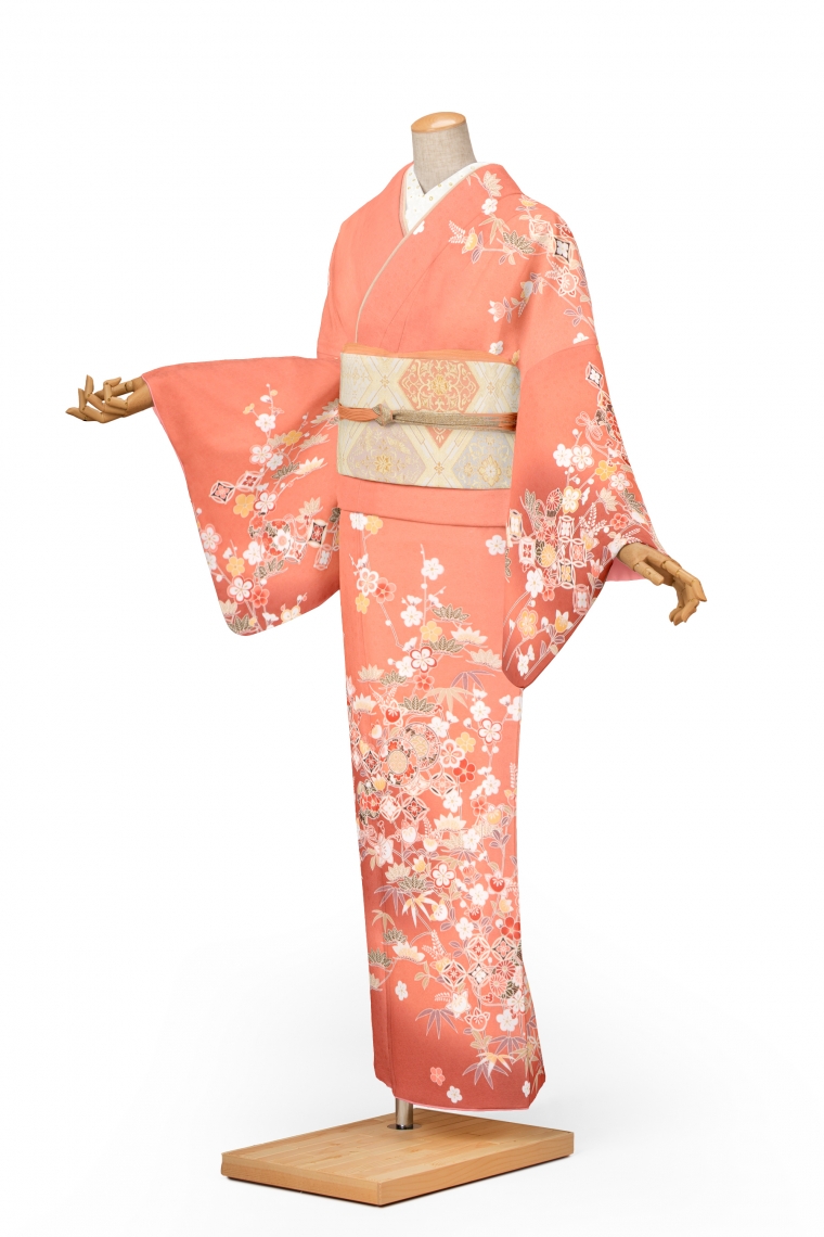 訪問着レンタル 訪問着Lサイズ ブランド:H・L 鼓に松竹梅 オレンジ サイズ:L 158~168cm 表地:合繊