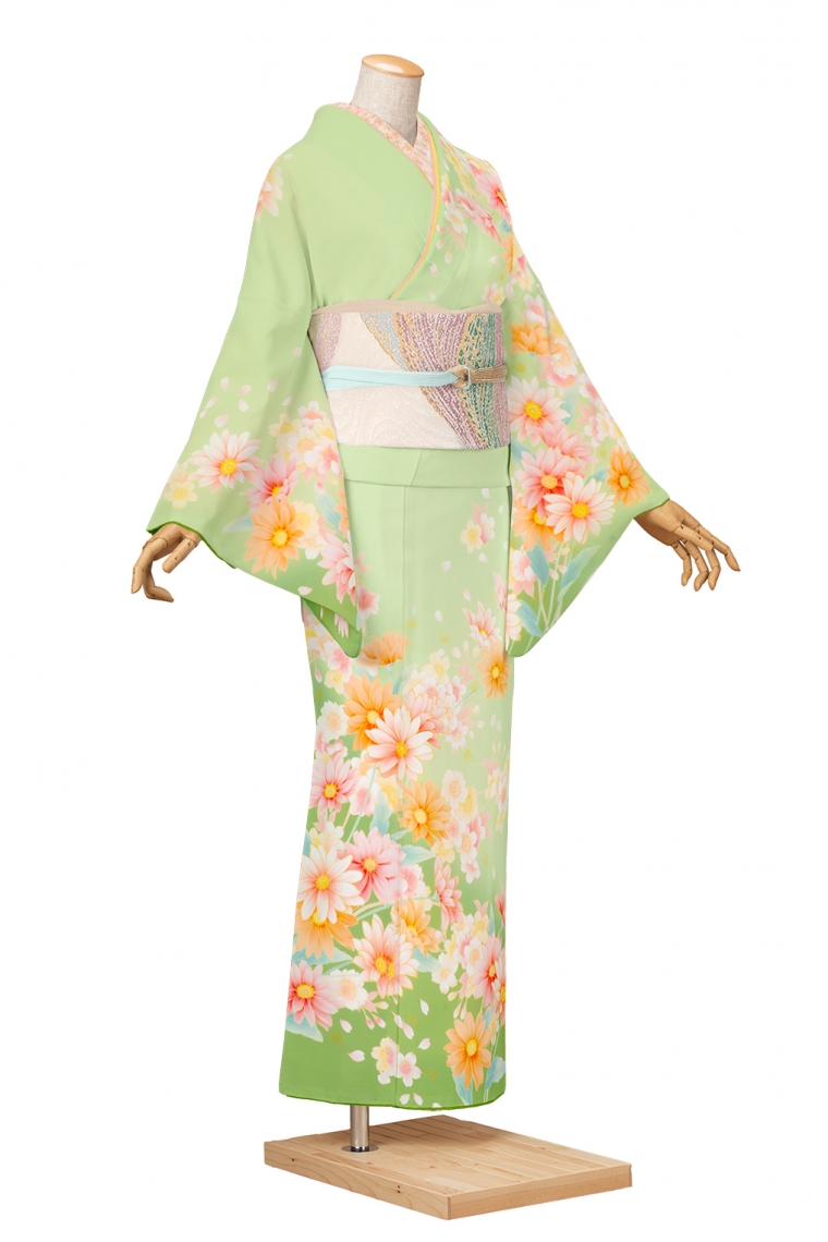 訪問着レンタル 訪問着MOサイズ 菊桜舞 グリーン サイズ:M-O 153~160cm ゆったりサイズ 表地:合繊