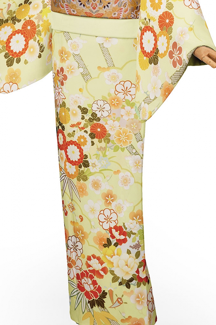 訪問着レンタル 訪問着LOサイズ 雲取四季花 黄緑 サイズ:L-O 158~168cm ゆったりサイズ 表地:合繊