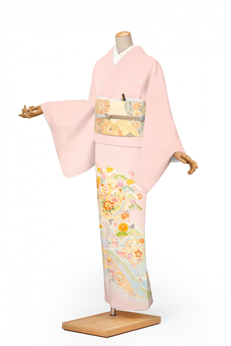 色留袖レンタル 色留袖Lサイズ 雪輪四季花文 ピンク 五つ紋:桔梗 サイズ:L 158~168cm 表地:正絹