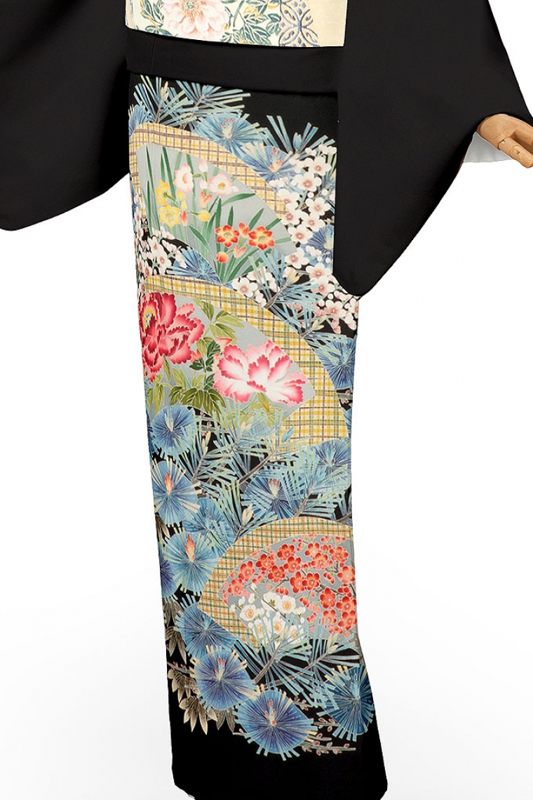 黒留袖レンタル 黒留袖Mサイズ 加賀友禅:窪田裕兆 扇面と四季花 五つ紋:左三ツ巴 サイズ:M 153~160cm 表地:正絹