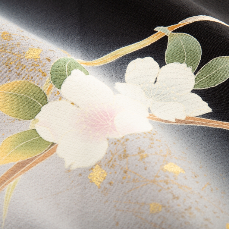 ぼかし染に大きな菊、桜、芒を描いた上品な着物。