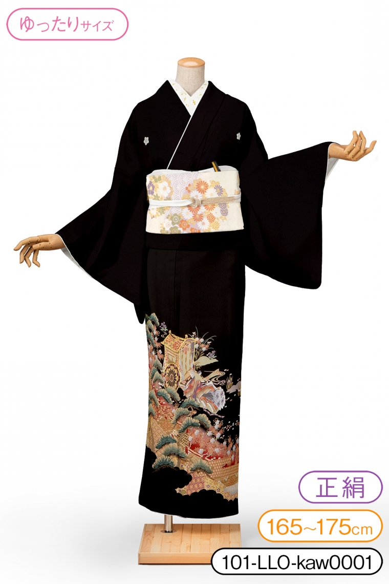 黒留袖レンタル 黒留袖LLOサイズ 御所車 五つ紋:桔梗 サイズ:LL-O 165~175cm ゆったりサイズ 表地:正絹