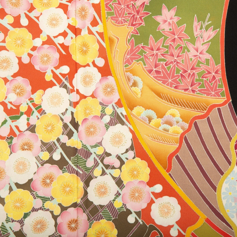 着物全体に大きな扇面図、四季花を描いた豪華な着物。石川県伝統工芸「加賀友禅」。加賀友禅作家:故矢田博。石川県重要無形文化財保持者。