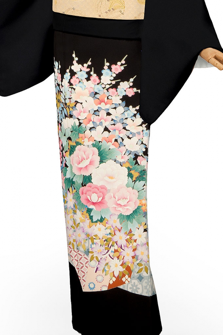 牡丹を中心にたくさんの四季花を加賀友禅で描いた豪華な着物。描いた石川県伝統工芸「加賀友禅」。加賀友禅作家:故島達男。